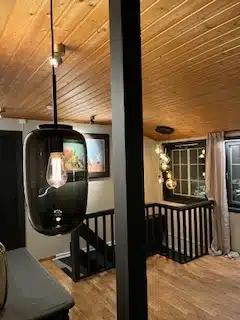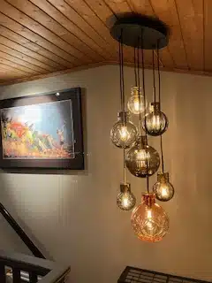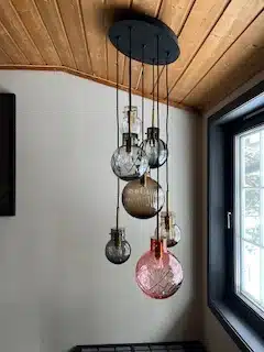 I Trappen opp henger hadeland krystall kuler fra tak.